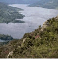 Views from above Snaid Burn ravine take in 'Arrochar Alps' and narrows of Loch Lomond. From